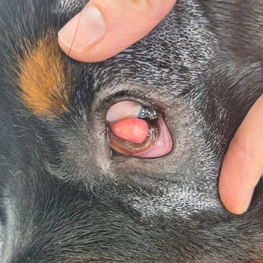 Roman presented to our Basingstoke practice with an inflamed area next to his left eye. This was found to be a swollen tear gland. He had developed a condition which Rottweilers are predisposed to, commonly termed cherry eye.